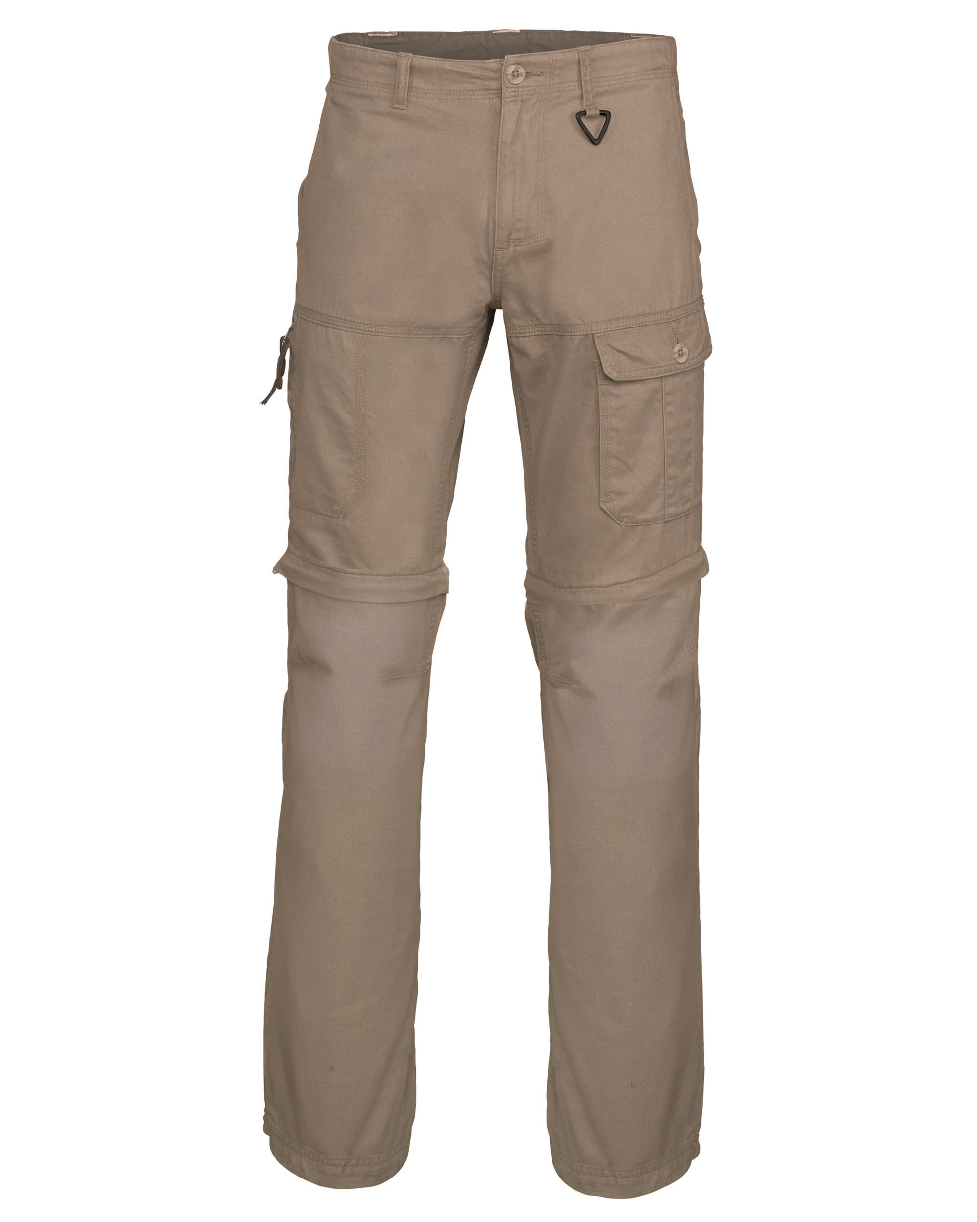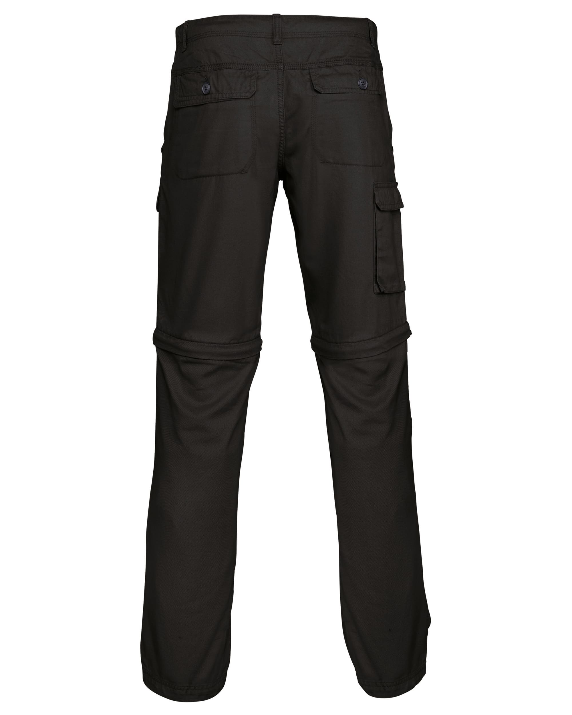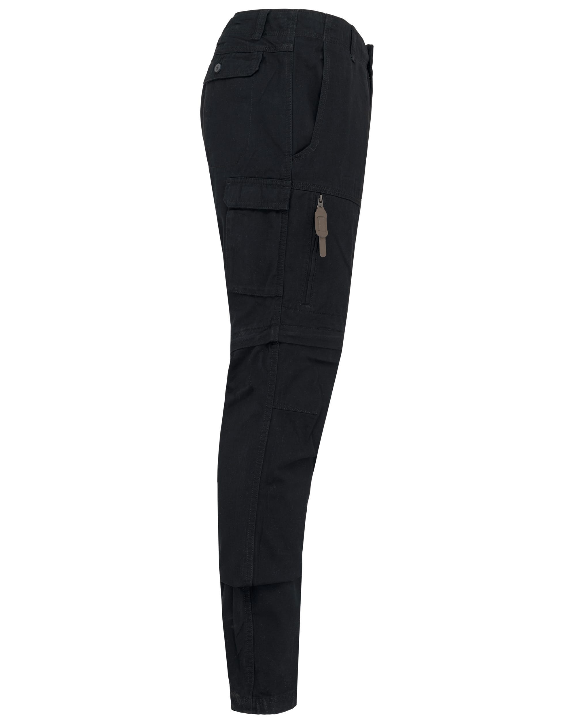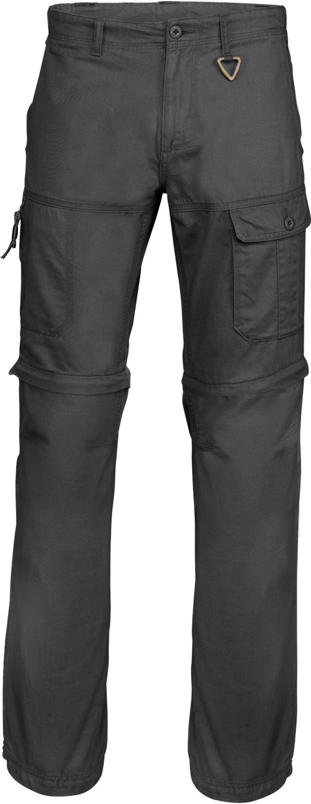 100% katoen sergé. Gewassen met enzymen. Ritssluiting en drukknopen. 4 voorzakken en 3 achterzakken. Afritsbare onderkant. Plastic ring voor karabijnhaak.