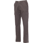 Herenbroek van lichte ripstop stretchstof, met elastiek opzij en ceintuurlussen. Ritssluiting met metalen knoop, twee zakken voor in klassieke snit, twee zakken met klep opzij met kliksluiting, een zak met rits links, een uitvouwbare zak voor rolmaat rechts, twee steekzakken achter met knoop en knoopsgat.