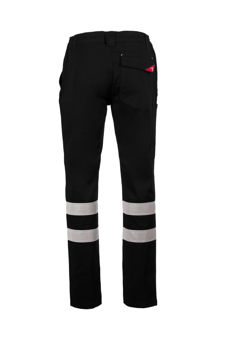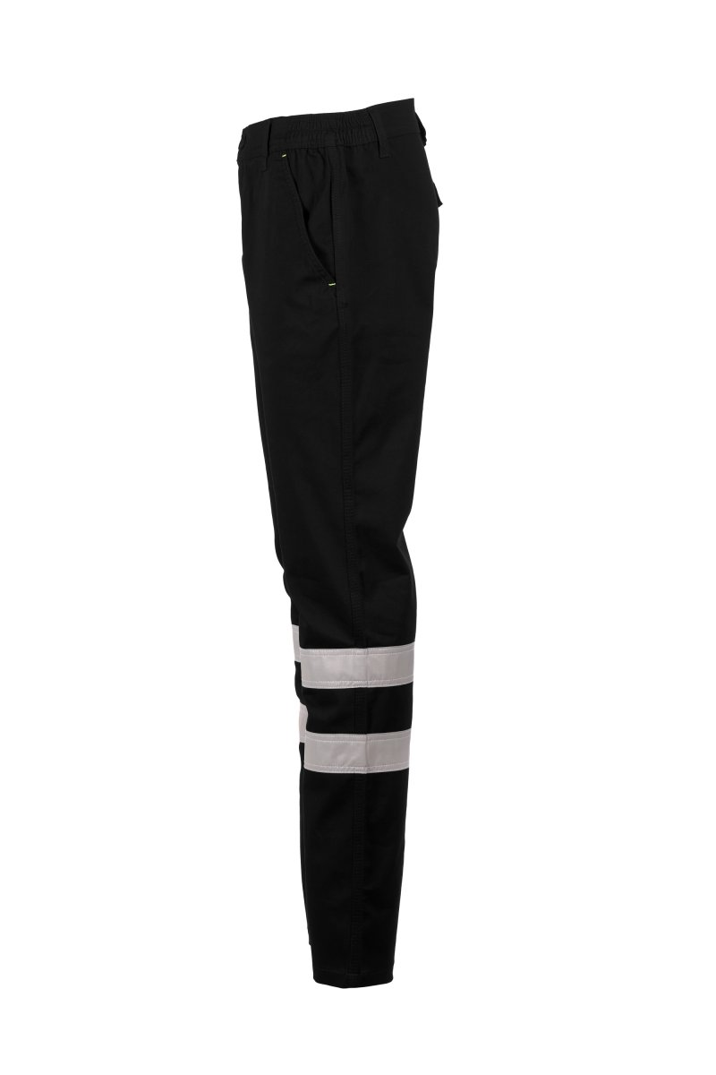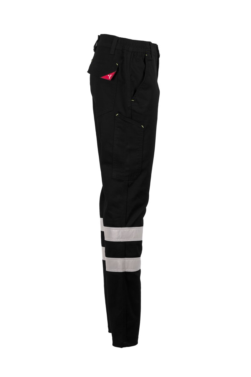 Katoenen broek in twill stretch, met reflecterende strepen cat. 1, riemlussen en elastiek in de taille, sluiting met rits en knoop. Twee voorzakken met klassieke snit, duimstokzak aan rechter zijkant, een achterzak met overslag en klittenband. Drievoudig gestikte naden.
