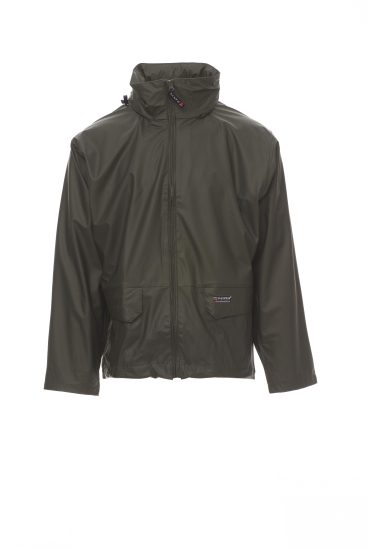 Regenjas met doorlopende, verdekte kunststof rits en metalen runner, uitvouwbare capuchon, verstelbare manchetten met drukknoopjes, trekkoord onderaan, twee opgezette zakken, gesealde naden.