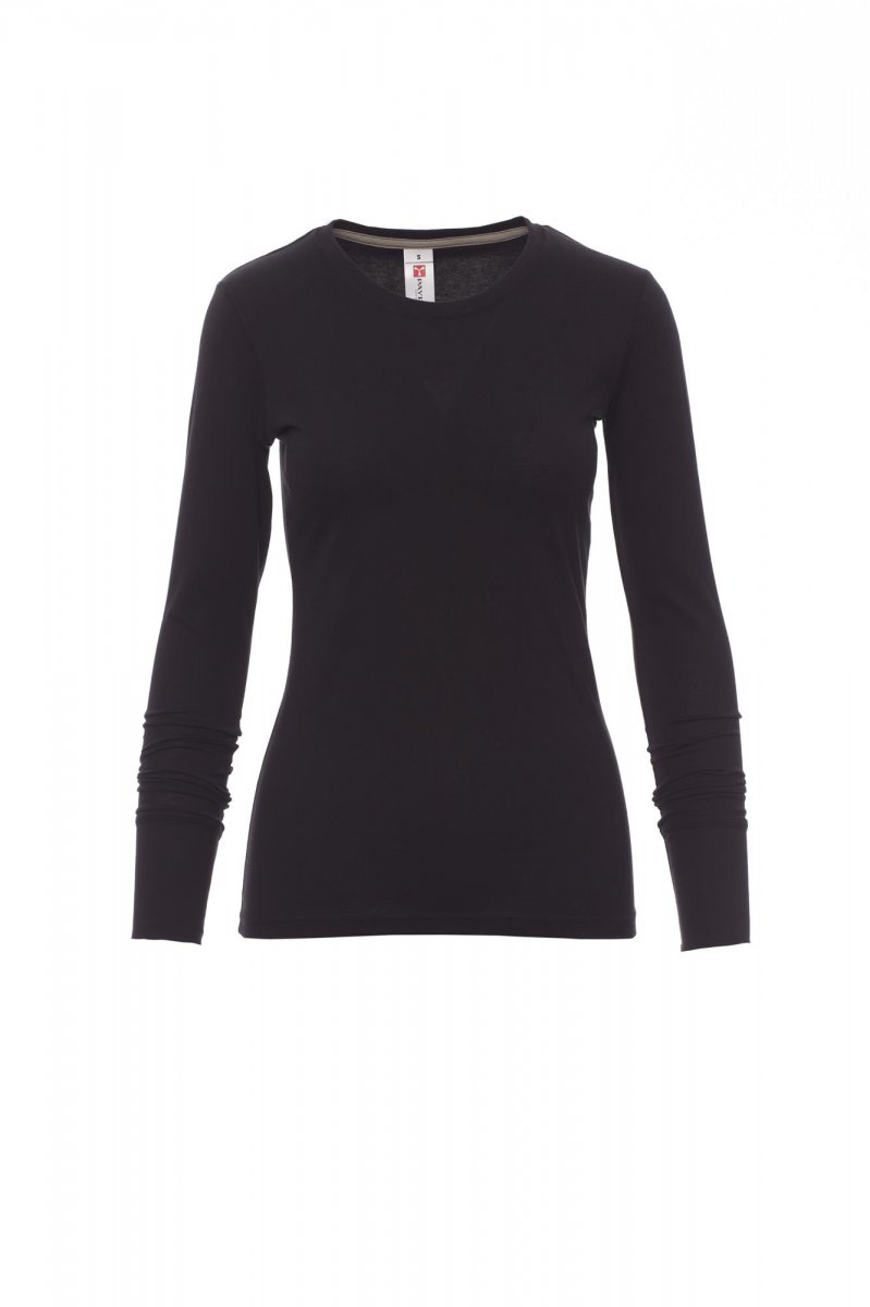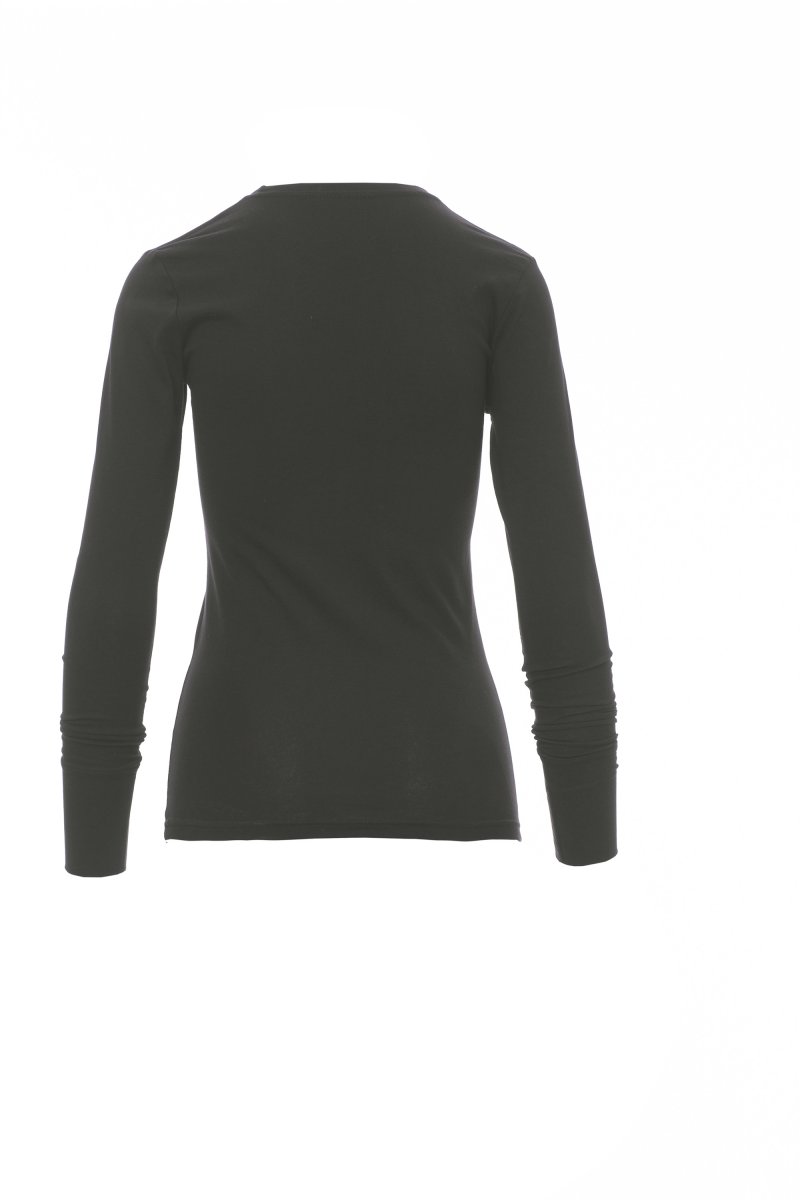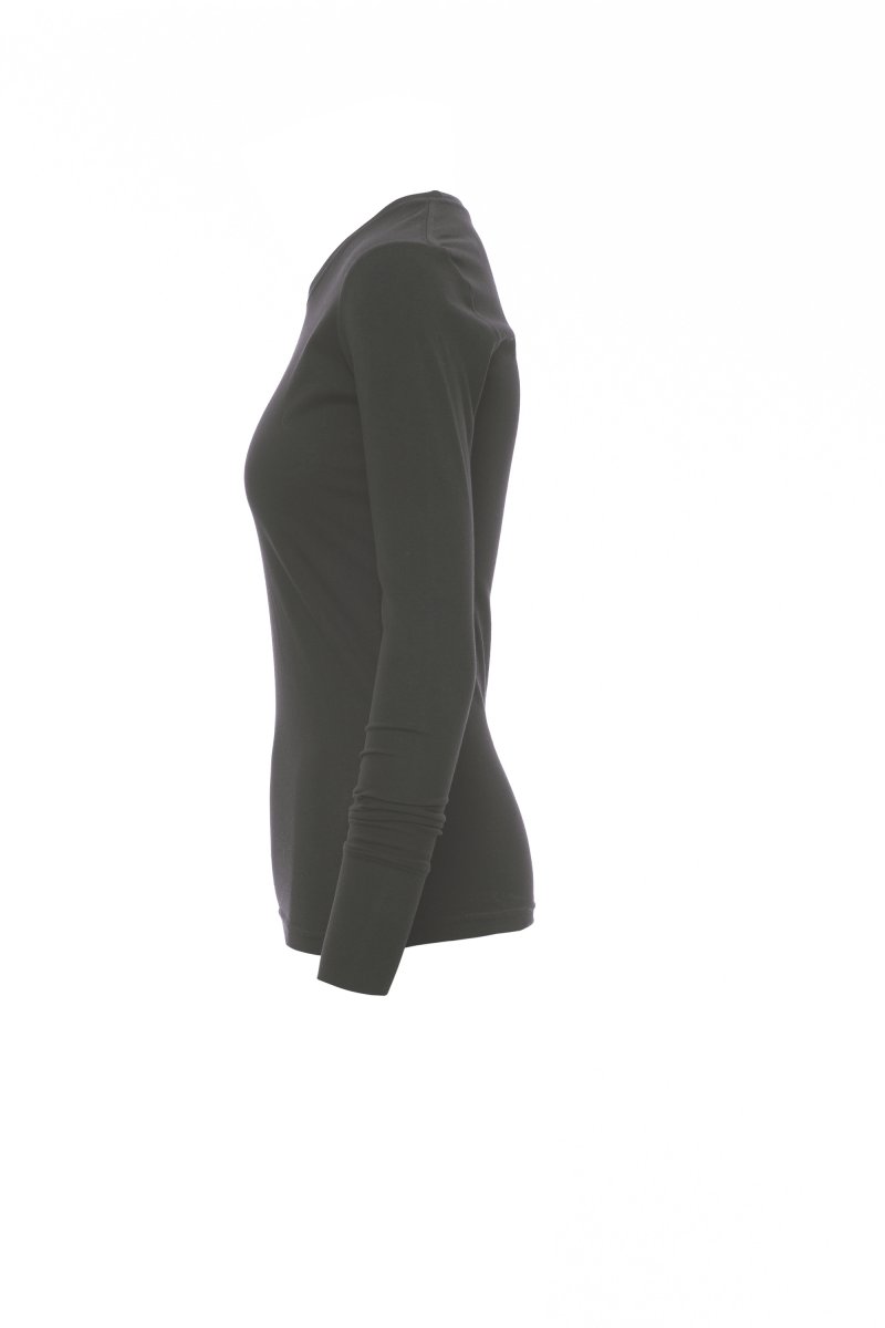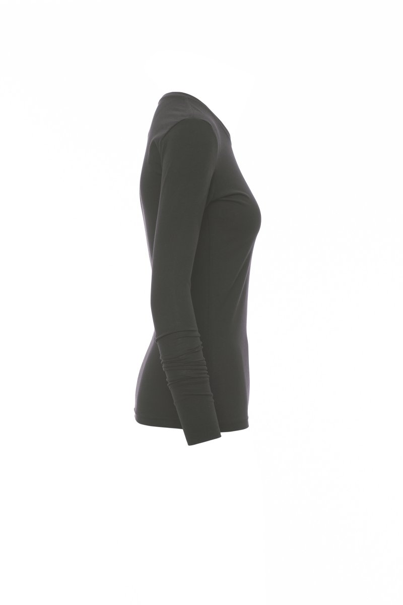 Nauwsluitend dames-T-shirt met lange mouwen en ronde hals, met afgezette geribde halsrand van 1,5 cm van een mix met spandex met stiksel aan de buitenkant, lange mouwboorden, contrasterende versterkingsband van schouder naar schouder zichtbaar aan de binnenkant van de nek, elastische naden, zijnaden.