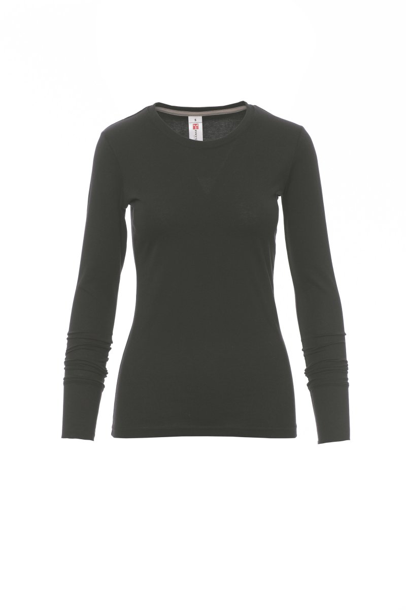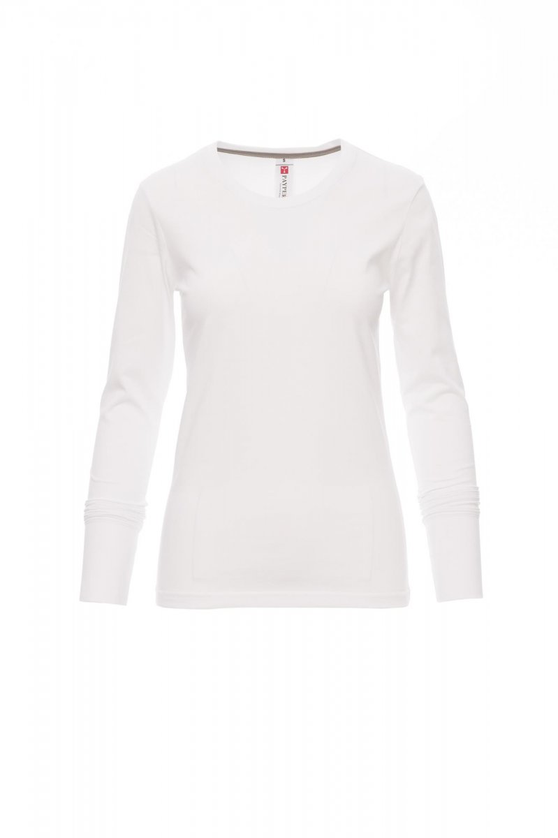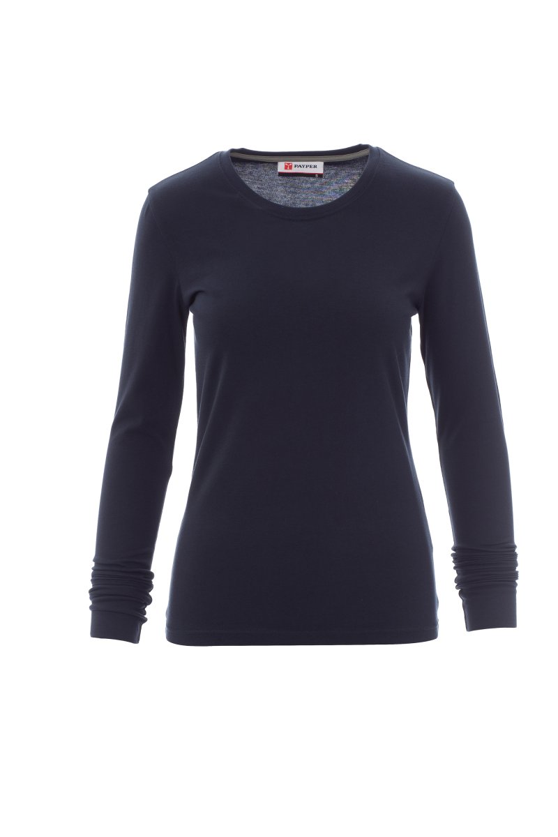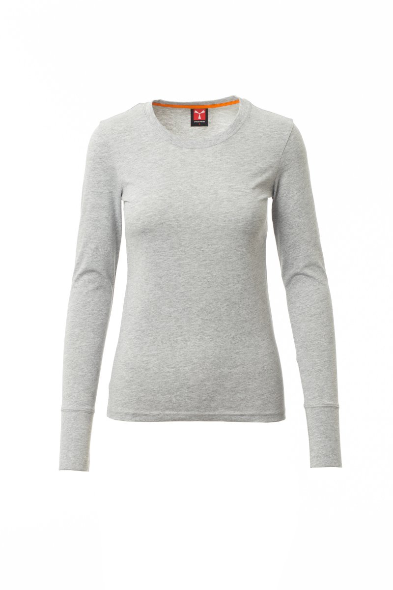 Nauwsluitend dames-T-shirt met lange mouwen en ronde hals, met afgezette geribde halsrand van 1,5 cm van een mix met spandex met stiksel aan de buitenkant, lange mouwboorden, contrasterende versterkingsband van schouder naar schouder zichtbaar aan de binnenkant van de nek, elastische naden, zijnaden.
