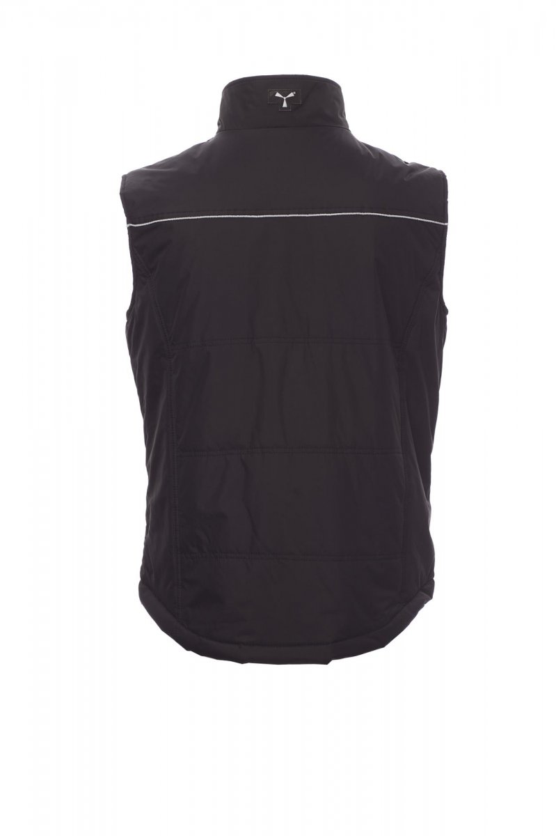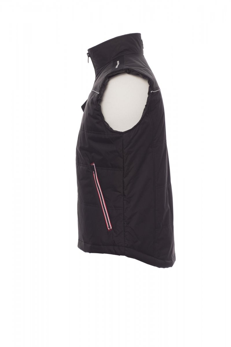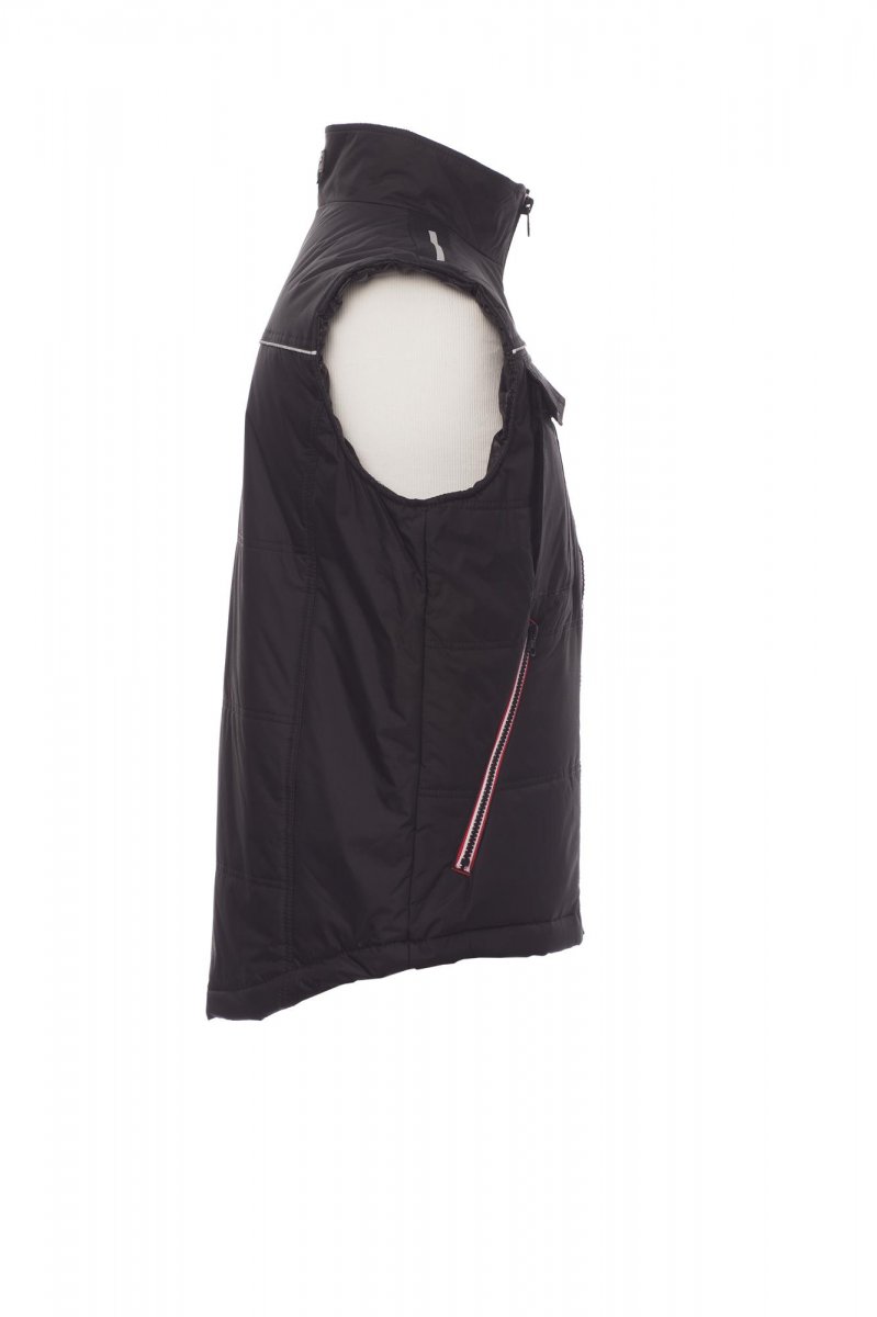 Unisex bodywarmer, contrasterende kunststof rits van 8 mm met metalen runner, gevormde rug, twee ruime buitenzakken met rits, ruime borstzak voor smartphone, ring voor badgehouder, reflecterende pipingband op borst en rug. Binnenzijde: doorgestikte gewatteerde voering, afgewerkt met voering met hoge dichtheid, binnenkraag van fleece, een binnenzak.
