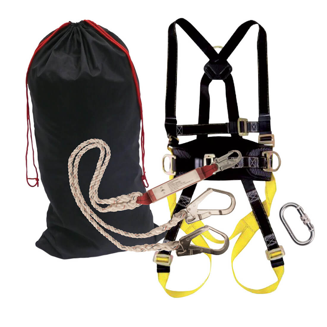 -2 puntharnas -Single Lanyard met schokdemper, karabijnhaak en steigerhaak -Nylon koordzakje