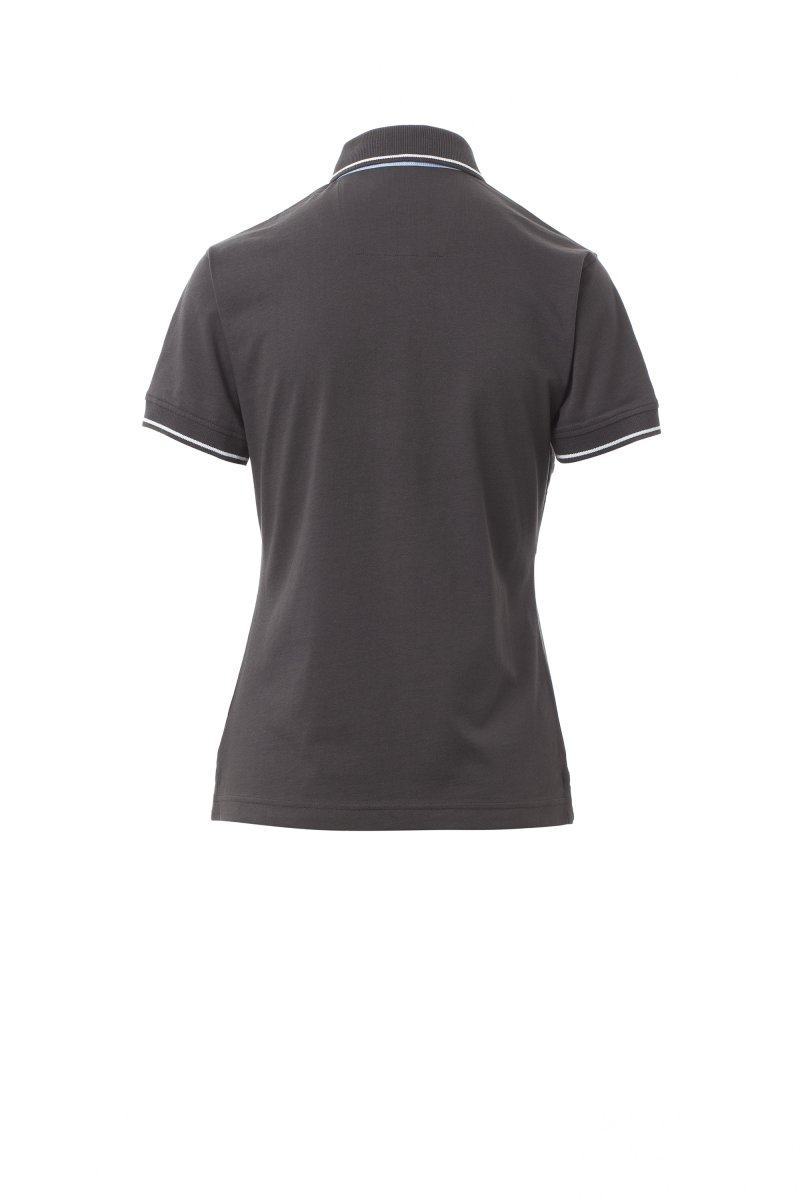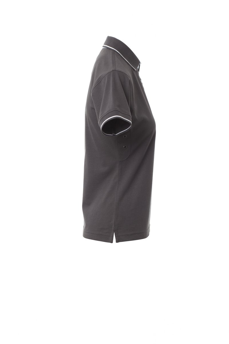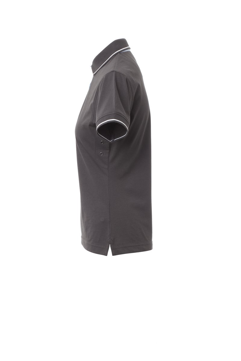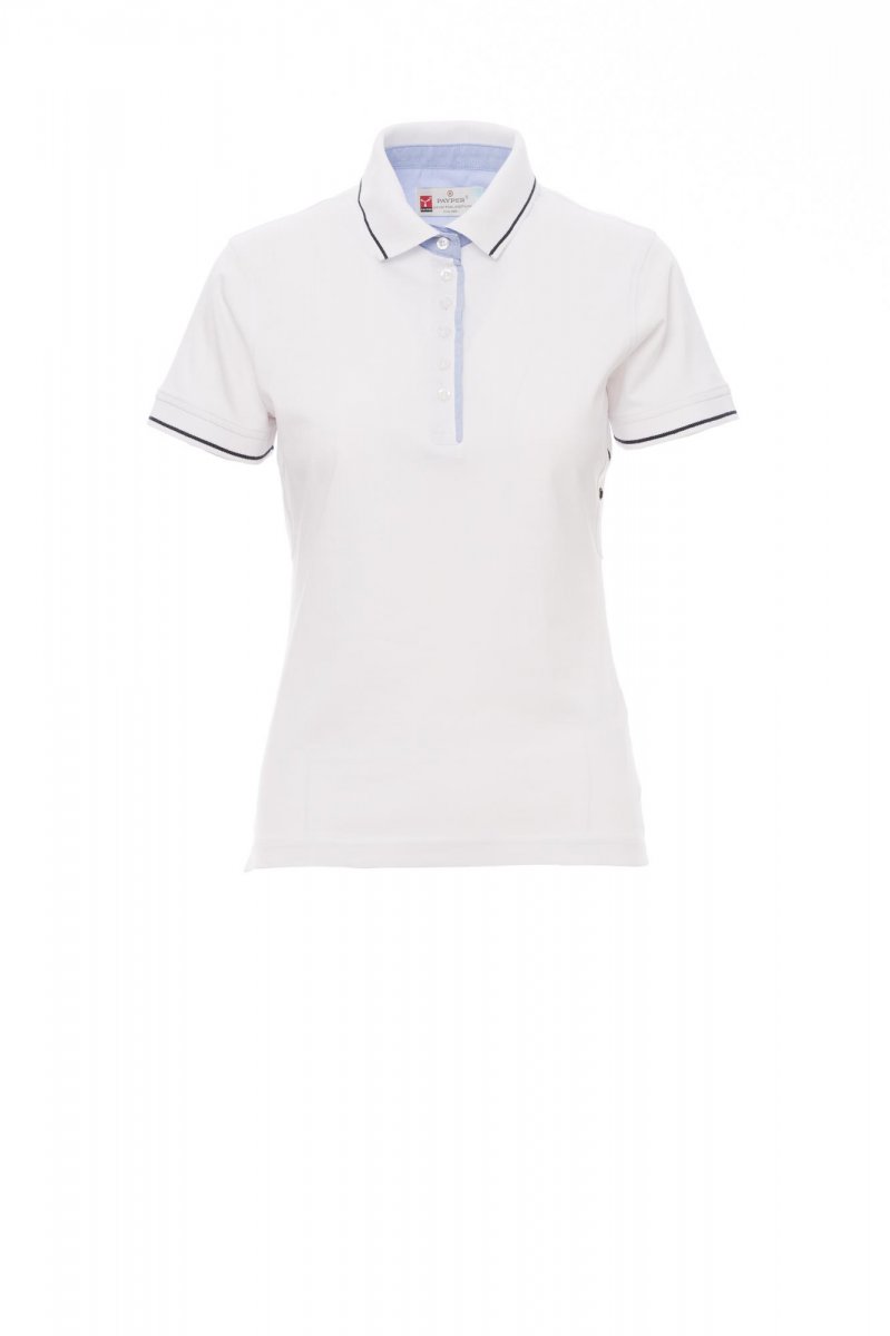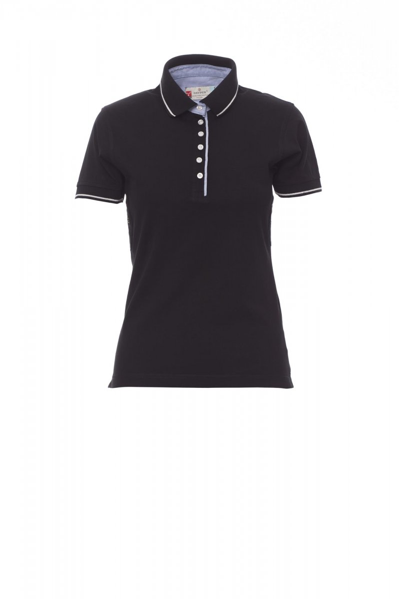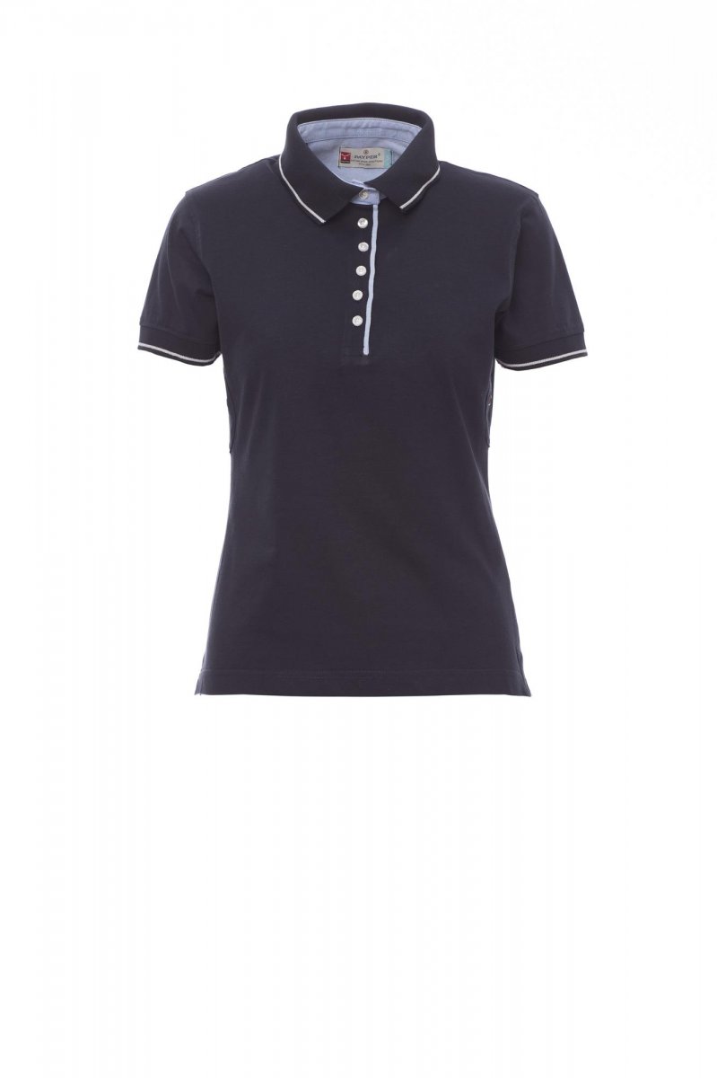 Nauwsluitend damespoloshirt met korte mouwen met 6 witte knopen, binnenkraag, overslag en zijsplitten in Oxfordblauw, ribkraag en mouwrand met fijne contrasterende strepen, oogjes onder de arm, zijsplitten met versterkte naden, verborgen stiksels bij de kraag, versterkingsband aan de zijkant, elastische naden, band aan de binnenzijde van de nek