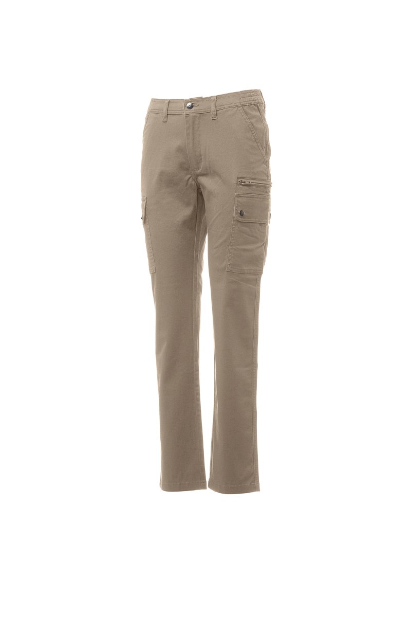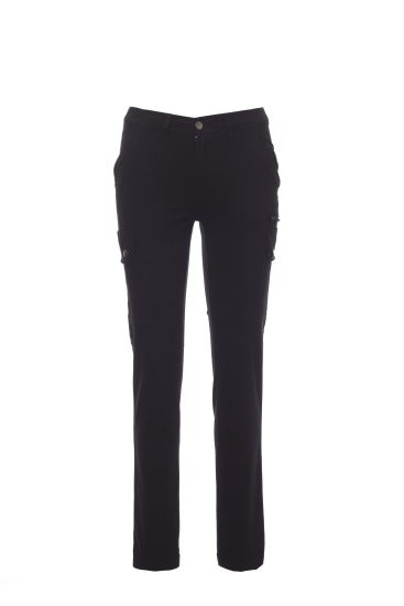 All-season damesstretchbroek met klassieke snit, elastische zijbanden en riemlussen in de taille, sluiting met rits en metalen knoop, twee voorzakken met klassieke snit, twee zijzakken met overslag en drukknopen, een zak met rits links, een verborgen duimstokzak rechts, twee ingezette achterzakken met knoopsgat en knoop.
