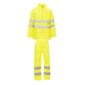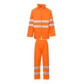 Regenpak met PU-coating, bestaande uit een jas met rits, uitvouwbare capuchon in de kraag, trekkoordje onderaan, onderkant van de mouw recht, verstelbaar met drukknoop, mesh aan de binnenkant op de rug, twee zakken vooraan met overslag. Broek met elastische taille en twee openingen aan de zijkant ter hoogte van de zakken, onderkant verstelbaar met een drukknoop. Met reflecterende banden op de jas en de broek. Thermogelaste naden. Pak ingepakt in een zakje dat met een rits is dichtgemaakt.