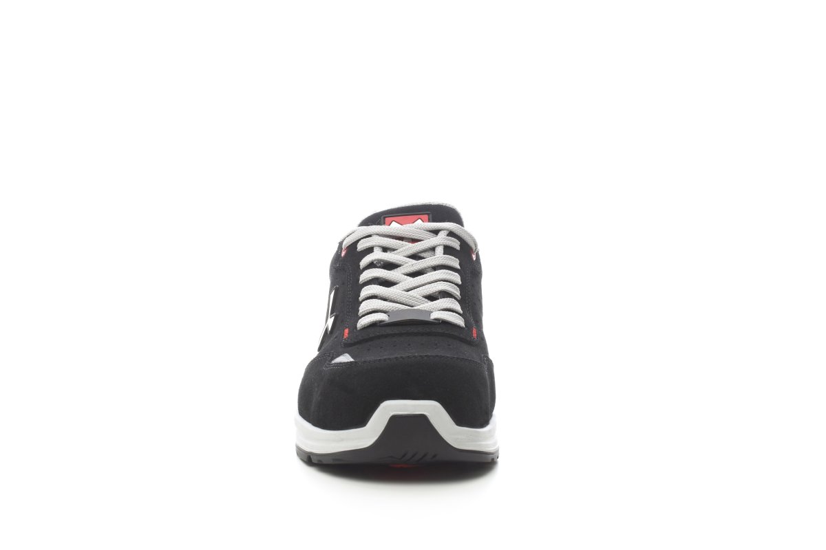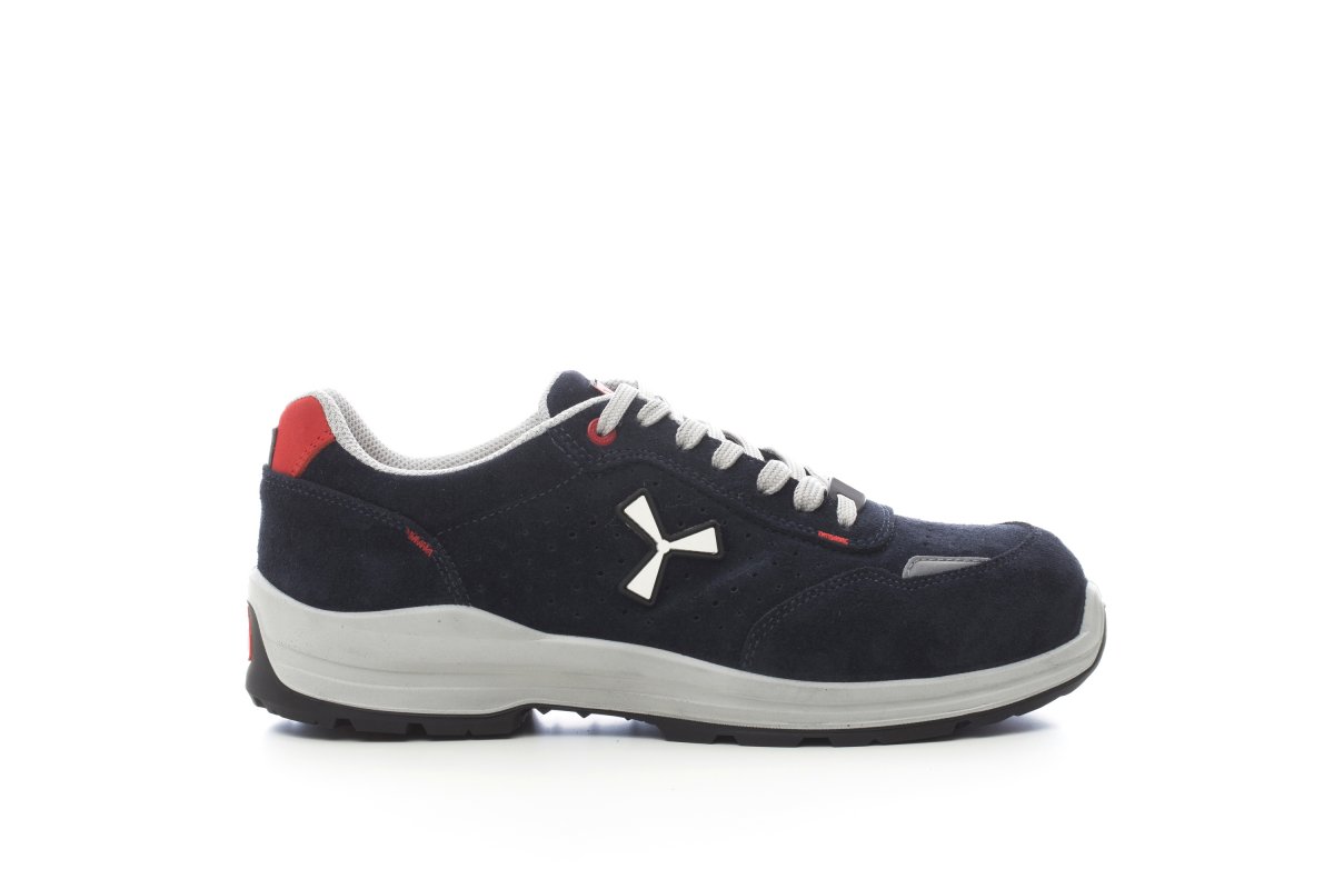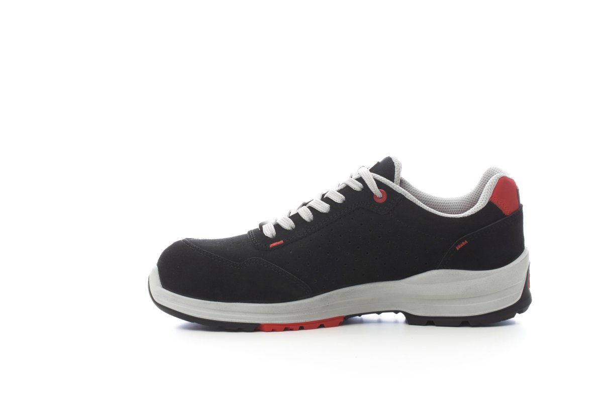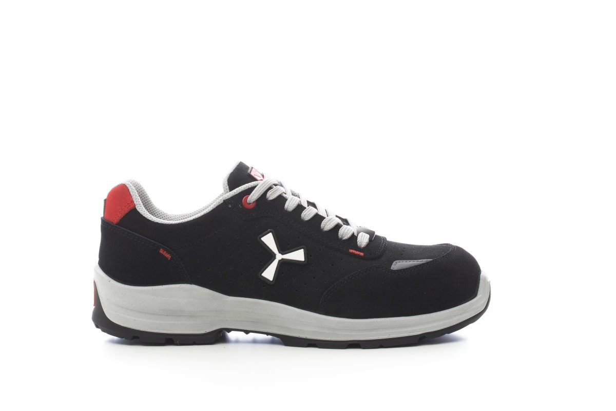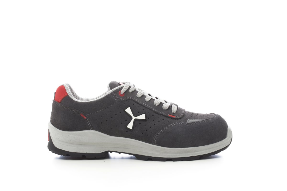 Lage antistatische veiligheidsschoen voor heren, bovenleer in opengewerkt, ademend, waterafstotend splitleer, ademende voering vanbinnen (over het hele binnenoppervlak) bestand tegen wrijving, 1+1 metalfree oogjes en 6+6 versterkte rijgvetergaten, reflecterende inzetstukken in de hakbescherming en aan de buitenkant van de neus, schoenneus in gegoten aluminium, verwijderbare inlegzool Ortholite X40 016, zool in stofplaat, gecertificeerd tegen perforatie, cambreur tegen verzwikking, onderneus in hoefijzervorm, binnenzool in zeer lichte polyurethaan, schokdemping MASTER BALANCE in PU polyether met grote stevigheid en uitgebalanceerde densiteit, zool XTRAIL GRIP in TPU met hakbescherming en neusbescherming.