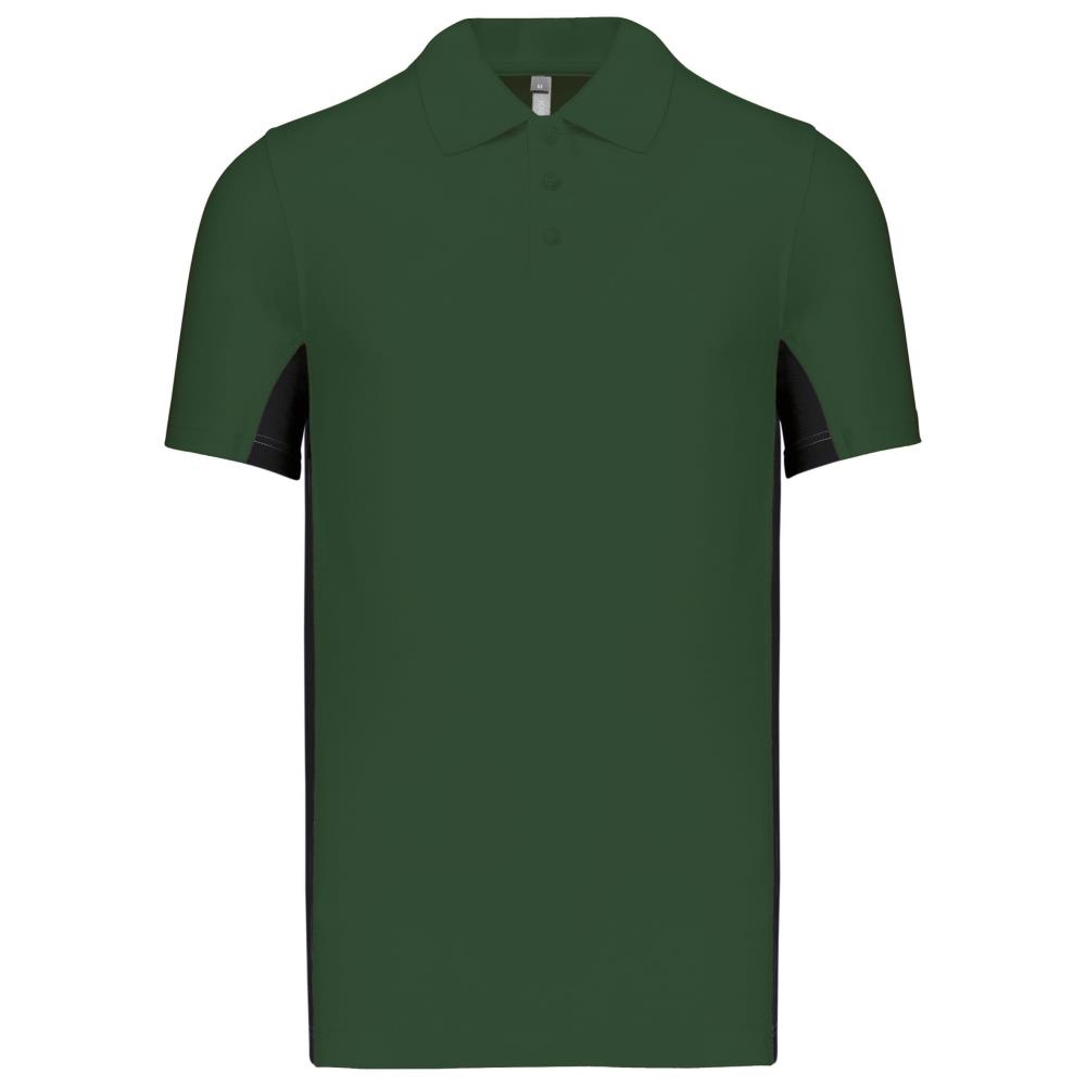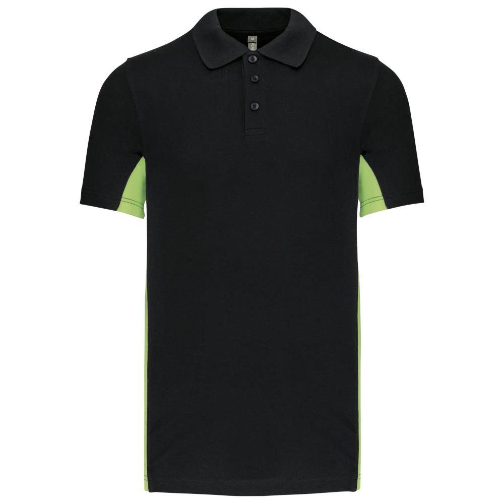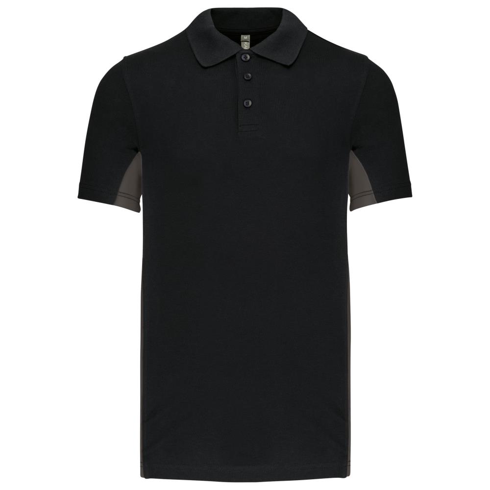 65% polyester / 35% katoen. (Black/Dark Grey ; Forest Green/Black ; Royal Blue/Navy : 65%gerecycled polyester / 35% katoen) .Piqué. Kraag in rib. Knooplijst met 3 toon op toon knopen. Zijkanten en onder de mouwen in constrastkleur. Geen ribboord aan de mouwuiteinden. Gecertificeerd STANDARD 100 by OEKO-TEX® N° CQ 1007/7, IFTH.