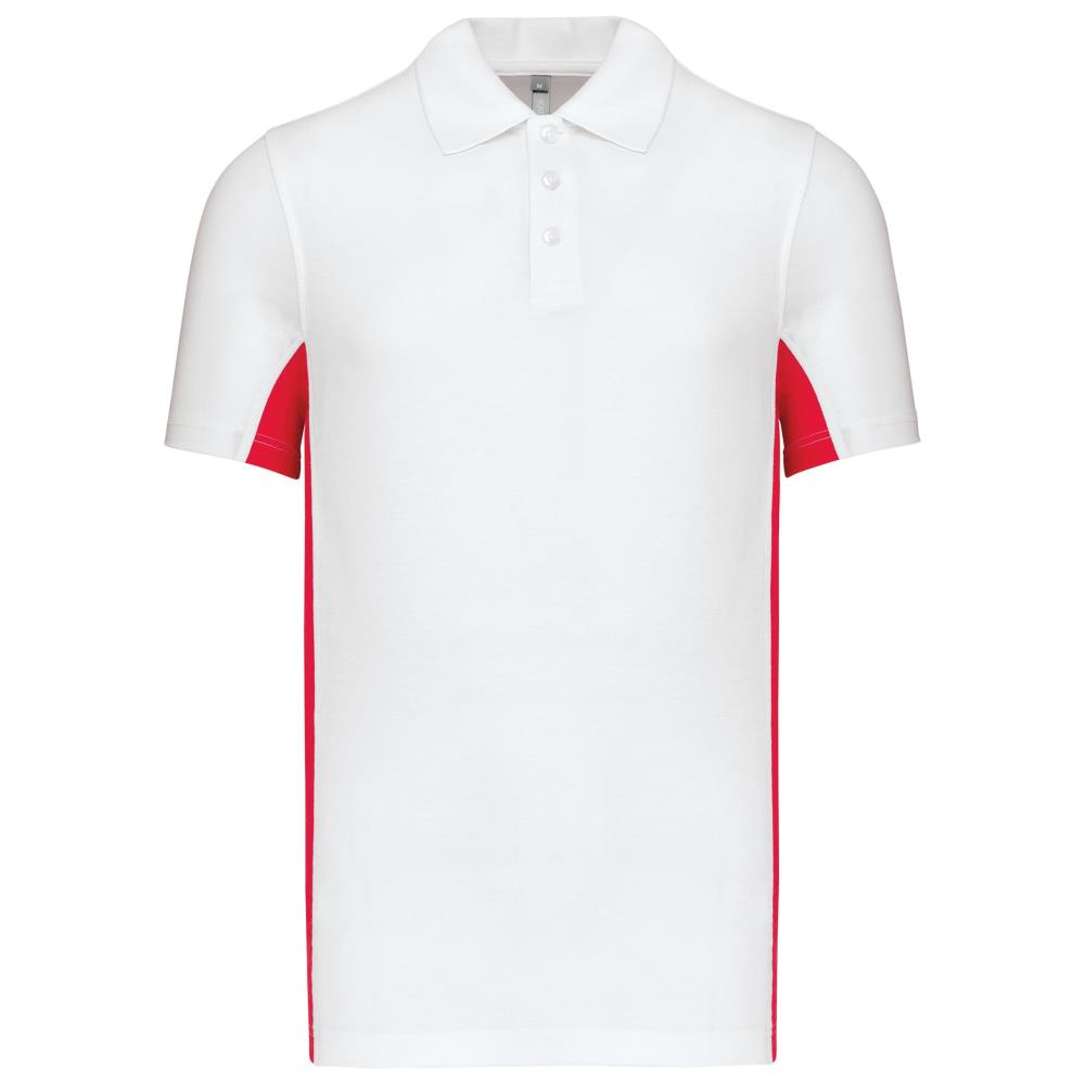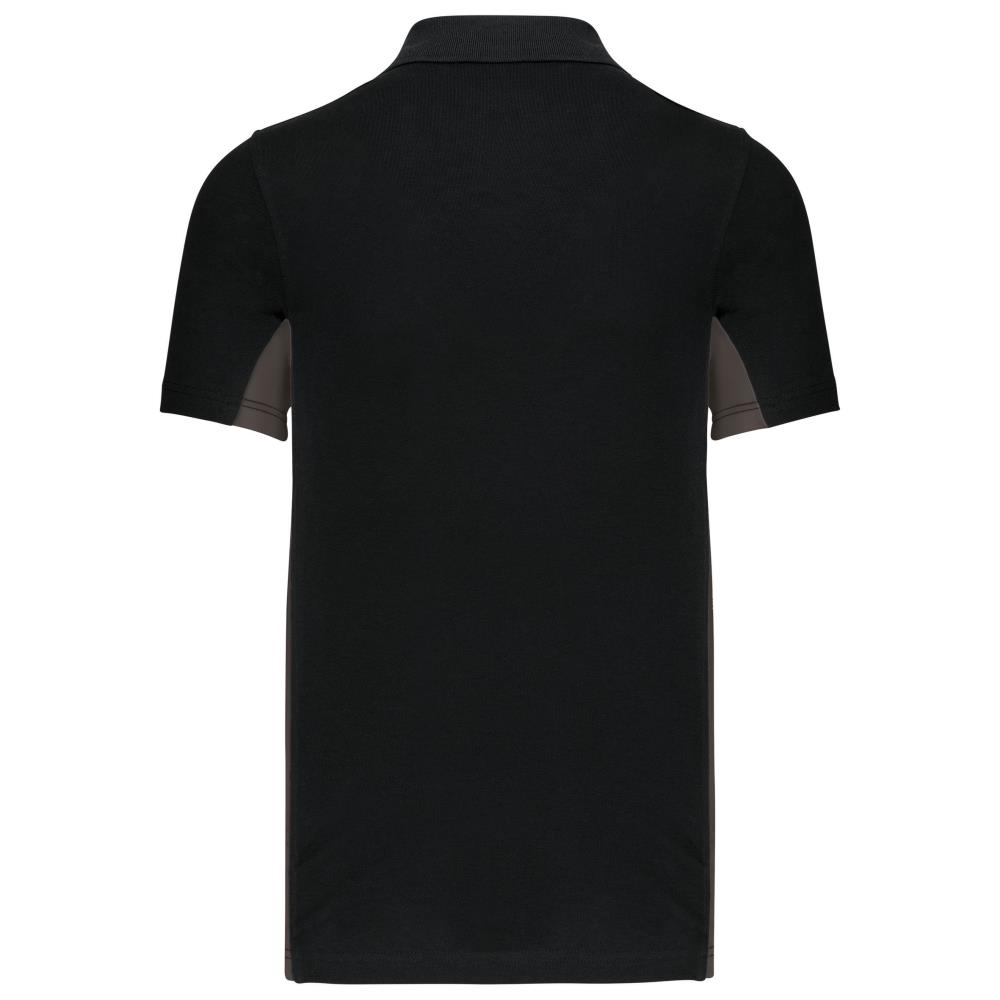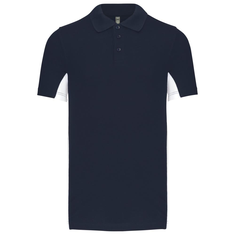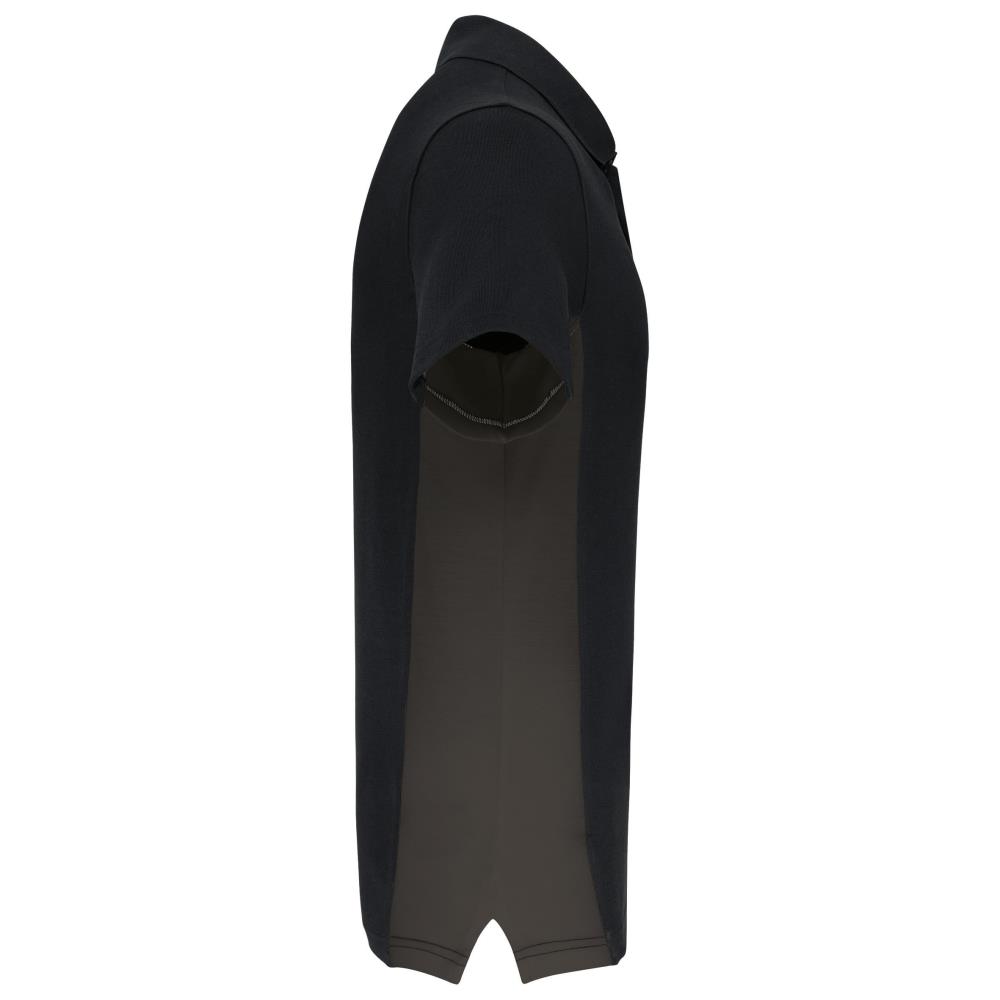 65% polyester / 35% katoen. (Black/Dark Grey ; Forest Green/Black ; Royal Blue/Navy : 65%gerecycled polyester / 35% katoen) .Piqué. Kraag in rib. Knooplijst met 3 toon op toon knopen. Zijkanten en onder de mouwen in constrastkleur. Geen ribboord aan de mouwuiteinden. Gecertificeerd STANDARD 100 by OEKO-TEX® N° CQ 1007/7, IFTH.