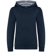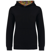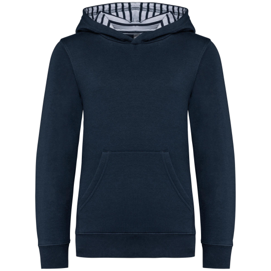 80% gekamd katoen / 20% polyester. Aan de binnenkant geborsteld fleece 3 draden. Fitted pasvorm. Rechte mouwen. Kangoeroezakken. Halvemaanvormige halsopening voor eenvoudige personalisatie van het merk aan de binnenkant van de kraag. Afwerkingen van 1x1 ribboord aan de mouwuiteinden en de boord. Gevoerde capuchon met een themastof in bedrukt jerseykatoen. Tear-away merklabel.