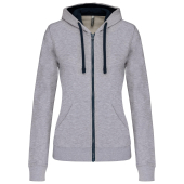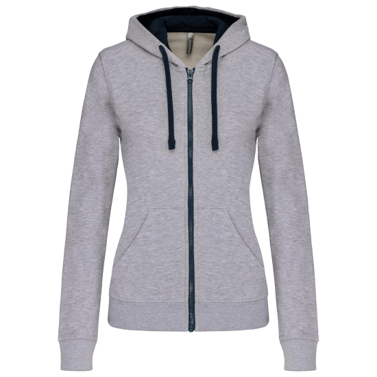 80% katoen / 20% polyester (Oxford Grey: 76% gekamd katoen / 21% polyester / 3% viscose). Geborsteld fleece aan de binnenkant. Gaatje voor draadje en lusje aan de kraag voor oortjes. Ribboord aan mouwuiteinden en onderkant kledingstuk. Gevoerde capuchon in contrasterende kleur met aanrijgkoordjes. Rits in contrasterende kleur. Gecertificeerd STANDARD 100 by OEKO-TEX®N° CQ1007/7, IFTH.
